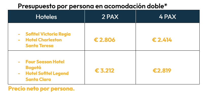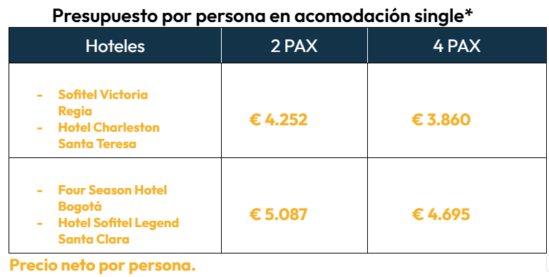Este itinerario combina lo mejor de Bogotá y Cartagena en una experiencia cuidadosamente diseñada para viajeros que buscan confort, cultura y exclusividad. Desde la capital, con sus íconos históricos, museos y vistas panorámicas, hasta el encanto caribeño de Cartagena, con su ciudad amurallada, fortalezas coloniales y experiencias de descanso frente al mar, cada día ha sido pensado para disfrutarse sin prisas. Traslados en vehículo de lujo, alojamiento en zonas exclusivas, gastronomía seleccionada y experiencias premium hacen de esta ruta una forma ideal de descubrir Colombia con estilo, tranquilidad y atención personalizada.
