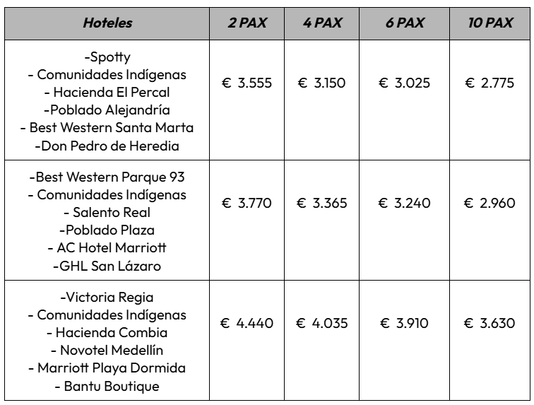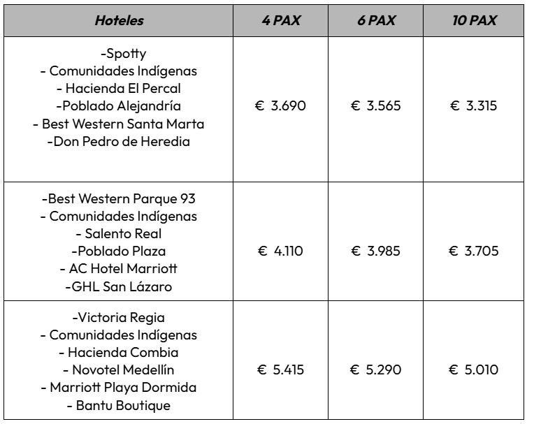 Embárcate en un viaje único por Colombia. Descubre la riqueza cultural de Bogotá en un completo city tour. Aventúrate en Mavecure para explorar sus imponentes formaciones rocosas. En Medellín, sumérgete en la transformación de la Comuna 13 y maravíllate con la belleza de Guatapé. Pereira te espera con la serenidad de Salento y la majestuosidad del Valle del Cocora, seguido de un fascinante Tour del Café. Relájate en las playas tropicales de Santa Marta y finaliza en Cartagena con un walking tour, explorando las encantadoras Islas del Rosario. Este itinerario te llevará a través de la diversidad y la belleza de Colombia.
