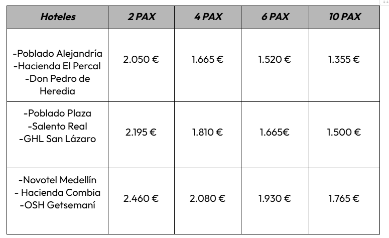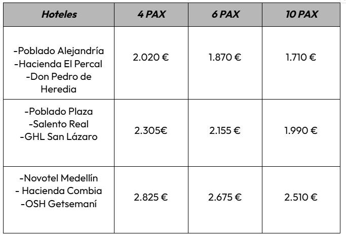 Este tour inicia y termina en aeropuertos diferentes. Vender máximo 8 días antes del inicio del viaje. para grupos máximos de seis personas. El Museo del Oro cierra los lunes. Para la temporada del 20 de diciembre al 10 de enero o para Semana Santa se debe reservar con 15 días de antelación y el precio sube el 10%.