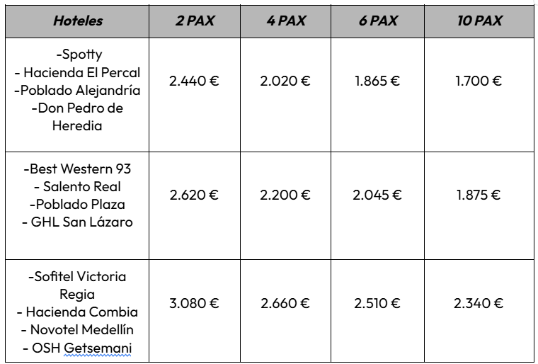 - Este tour inicia y termina en diferentes aeropuertos. Vender máximo 8 días antes del inicio del viaje. El Museo del Oro cierra los lunes.