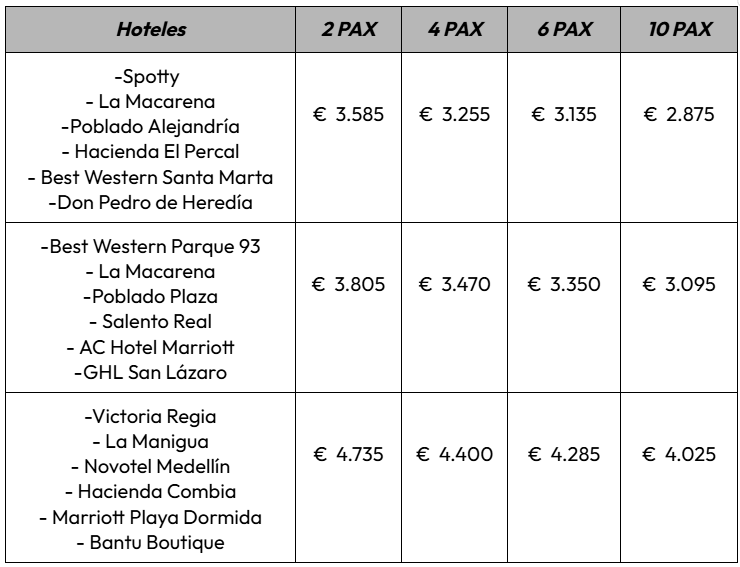 - Este tour inicia y termina en diferentes aeropuertos. Vender máximo 8 días antes del inicio del viaje. El Museo del Oro cierra los lunes.