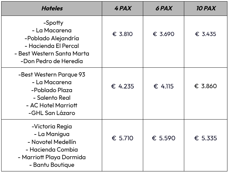 Embarquese en un itinerario inolvidable por Colombia. En Bogotá, un city tour les sumergirá en la riqueza cultural de la capital. Descubran la maravilla natural de Caño Cristales en La Macarena. En Medellín, la Comuna 13 y la belleza de Guatapé los sorprenderán. Pereira les espera con la serenidad de Salento y la majestuosidad del Valle del Cocora, seguido de un romántico Tour del Café. Relájense en las playas tropicales de Santa Marta. Finalizaran su viaje en Cartagena con un walking tour, explorando las Islas del Rosario, creando recuerdos inolvidables en este rincón mágico de Colombia.